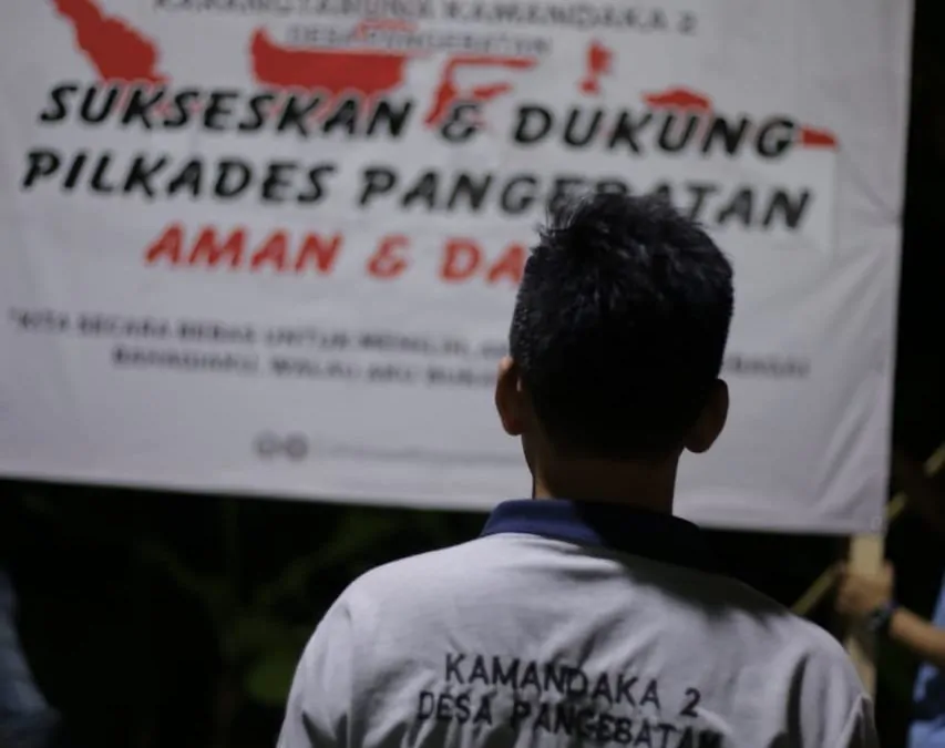 Sejumlah pemuda yang tergabung dalam Karang Taruna Kamandaka 2 Desa Pangebatan bergotong royong memasang baliho sebagai bentuk kampanye mengajak warga ciptakan suasana sejuk dan damai dalam pelaksanaan Pilkades Serentak 2019 Desa Pangebatan di depan Balai Desa pada Kamis, (11/7).